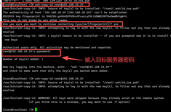 生成后,将公钥复制到目标服务器(存储备份日志的服务器)~/.ssh/authorized_keys的文件中,执行命令 ssh-copy-id 用户名@目标服务器IP或者域名 (注:替换用户名@目标服务器IP为实际的目标服务器的用户名和IP地址)