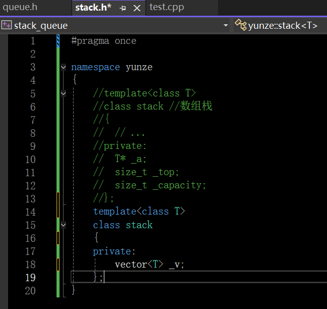 代码里用的是vector< int >作为底层(yunze::stack<int, vector< int >>),但如果场景变了:
