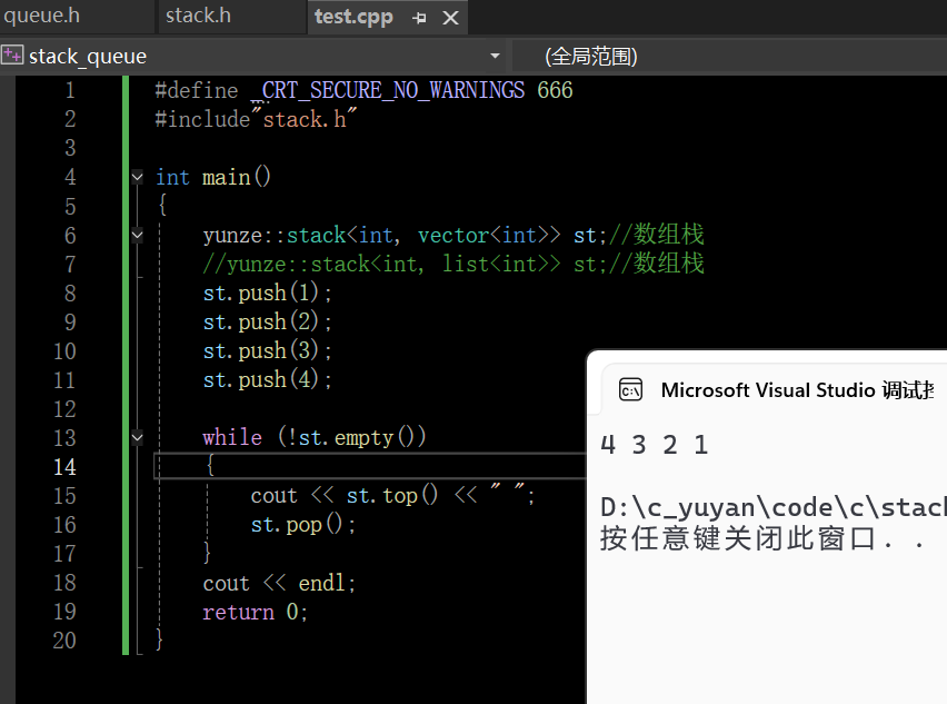 yunze::stack<int, list<int>> st; // 底层变成链表,其他代码完全不用改