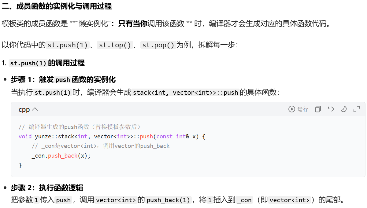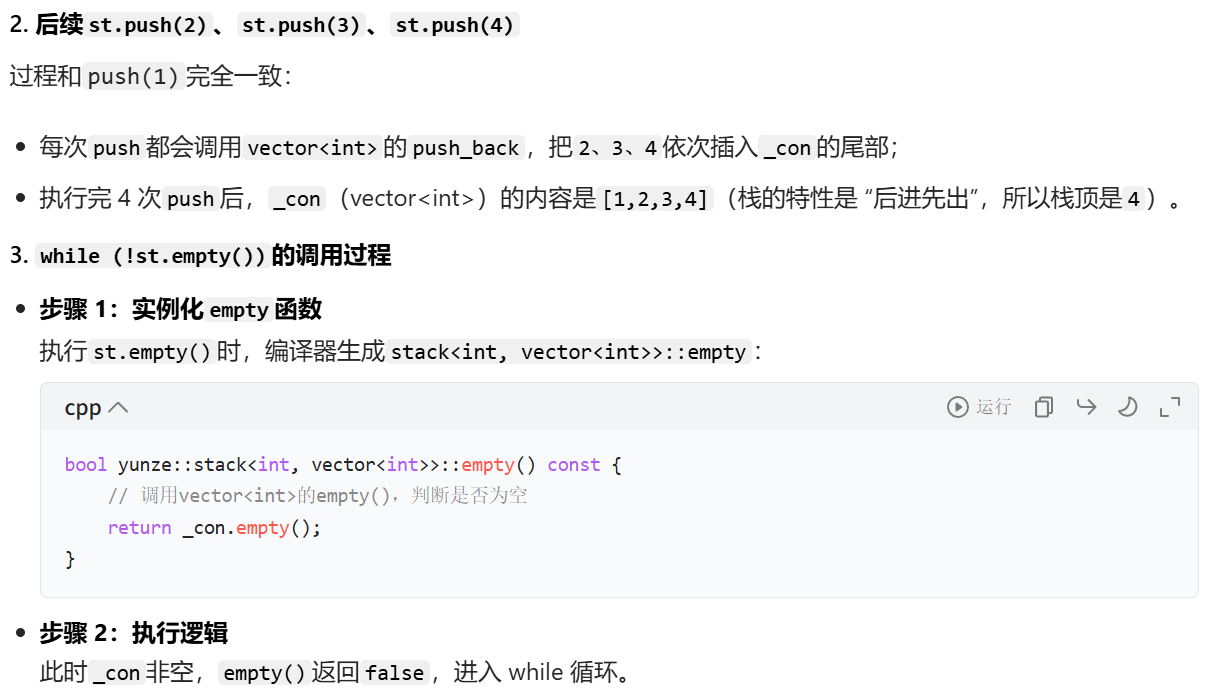 而现在的stack直接用vector/list作为底层容器 ------ 这些容器本身已经实现了动态扩容、内存管理、尾插 / 尾删 等功能,你只需要调用_con.push_back()/_con.pop_back(),相当于 "站在现有容器的肩膀上",不用重复造轮子。