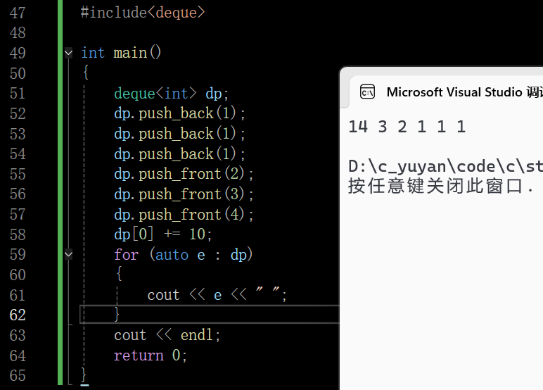 deque(双端队列) :是一种双开口的"连续"空间的数据结构,双开口的含义是:可以在头尾两端进行插入和删除操作,且时间复杂度为O(1),也可以在中间任意位置插入删除,与vector比较,头插效率高,不需要搬移元素;与list比较,空间利用率比较高,其在功能上是list和vector的融合体,