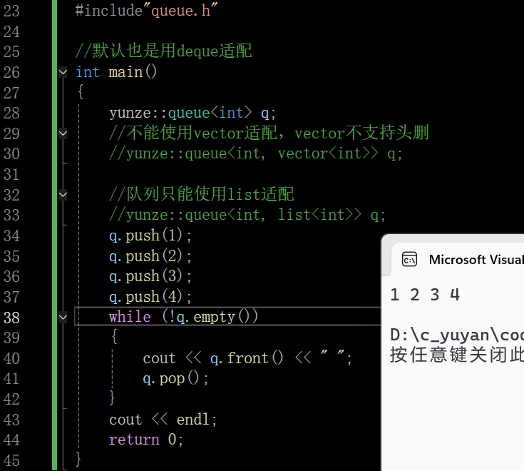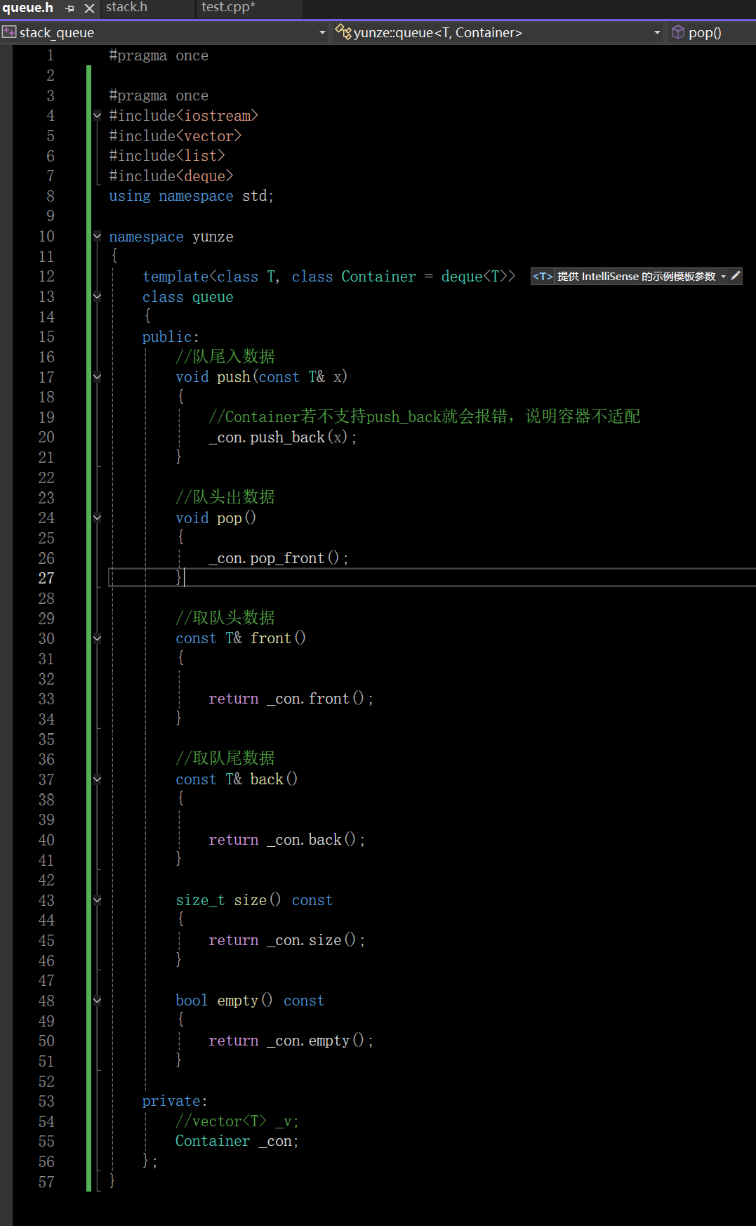 也可以在queue的类中用erase代替pop_front();vector不支持直接头删,但是erase是支持头删的,但是这就让效率强行降低了,STL中的vector设计之初没有直接支持头删接口的原因就是希望少用(功能上还是支持的)
