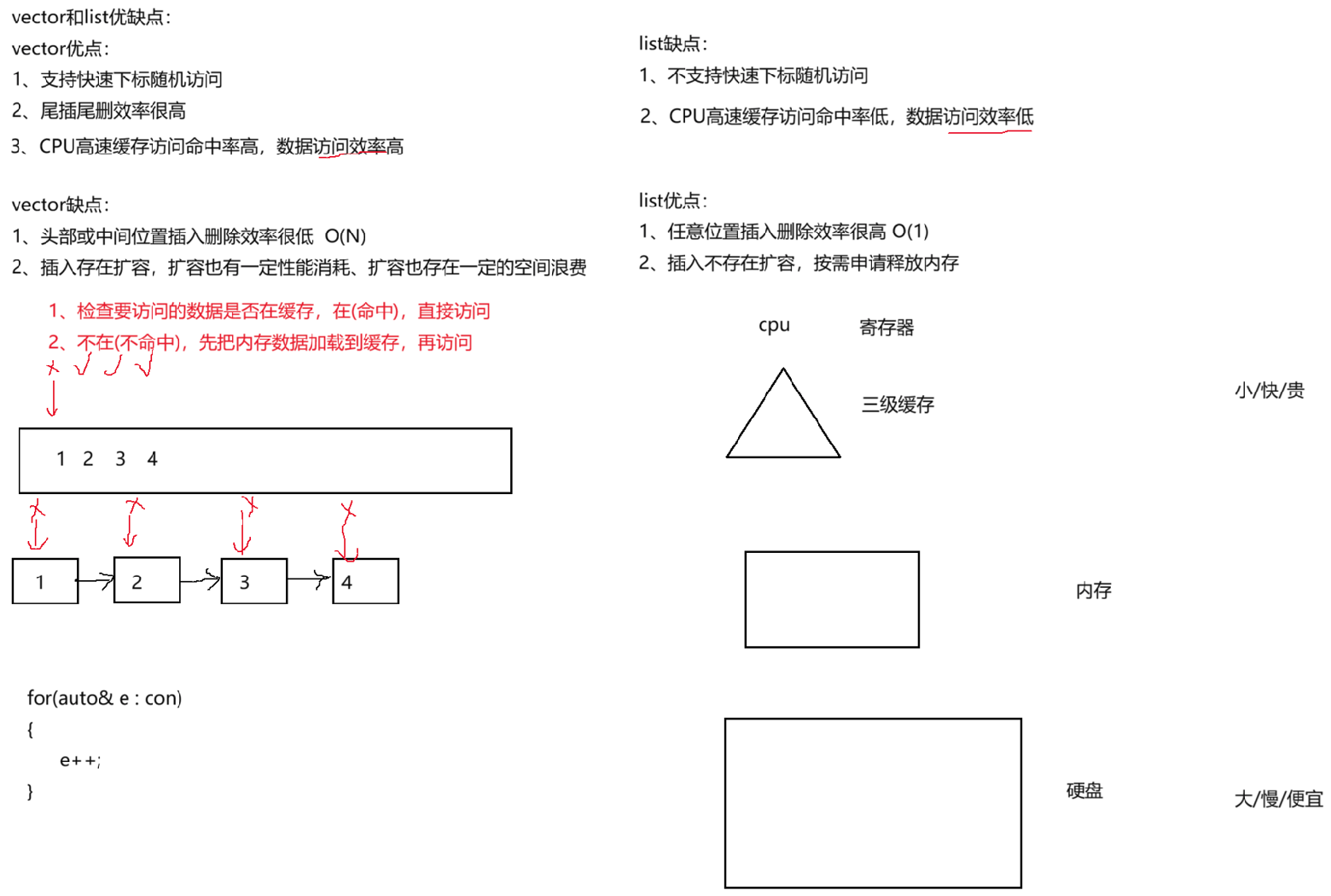 CPU高速缓存访问命中率高间接的也就是说数据访问效率高,反之。该优缺点在归并排序和快速排序的性能测试尤其体现,这里的性能测试该篇文章有写C++ List 容器详解:迭代器失效、排序与高效操作