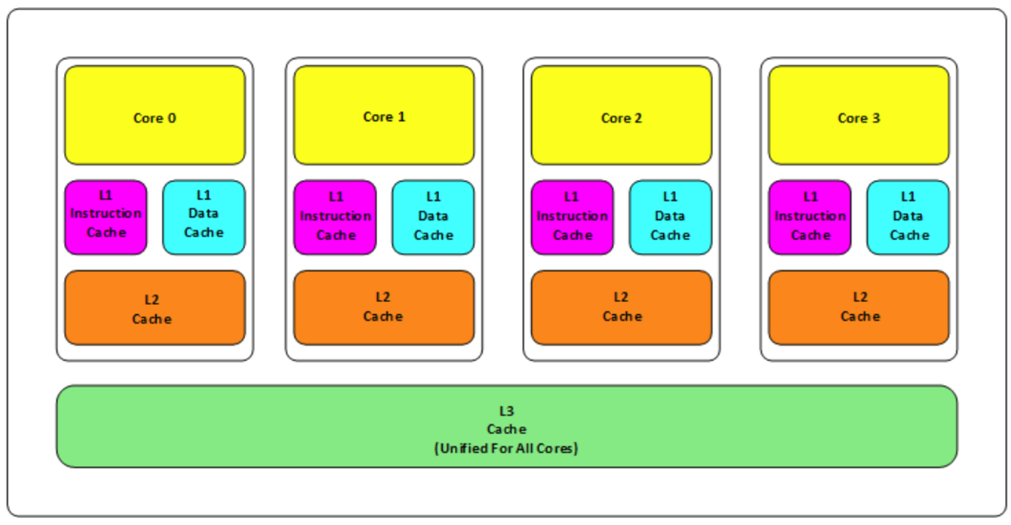 - L3 缓存:所有 CPU 核心共享,容量最大,速度比 L2 慢,但仍远快于内存。