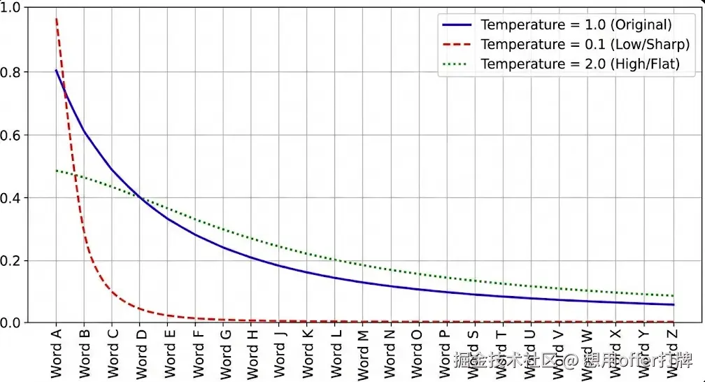 - 原理: 它会缩小概率差距,让概率分布变"平"。原本概率较低的生僻词,现在也有了被选中的机会。