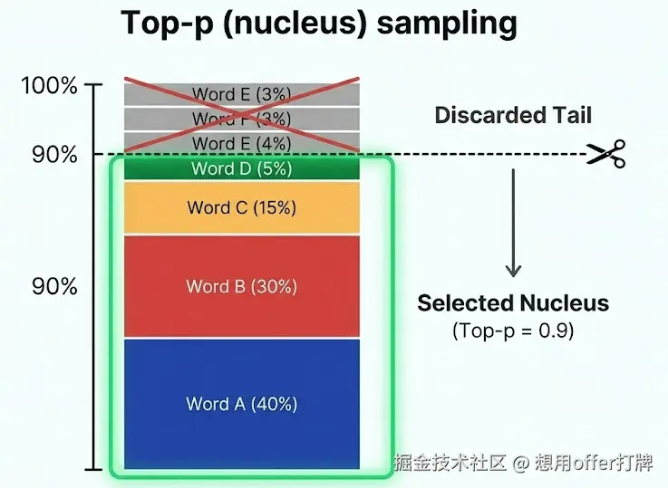 - Top-p (0.9) 逻辑:取"北京"一个词,概率就够了。