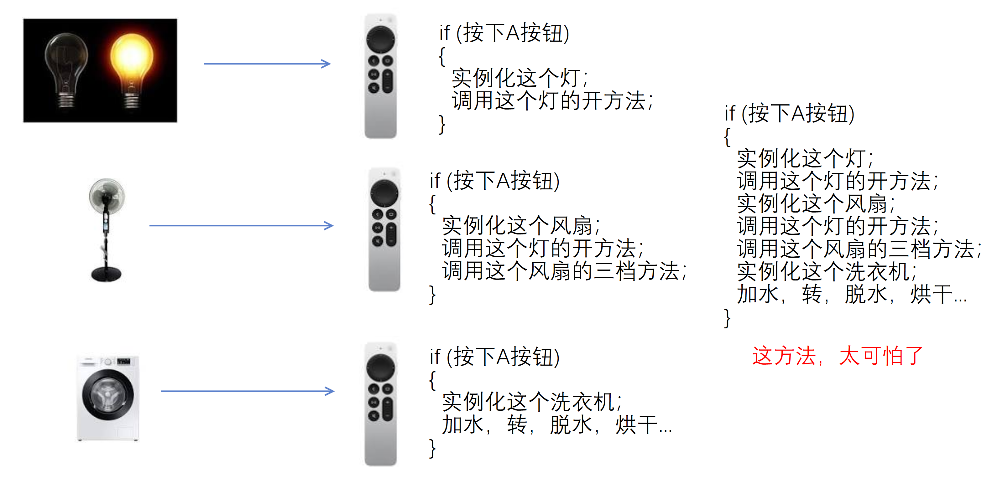 单一职责原则(SRP):灯,风扇,洗衣机好像啥都没干,遥控器帮他们全都干了,严重违反。