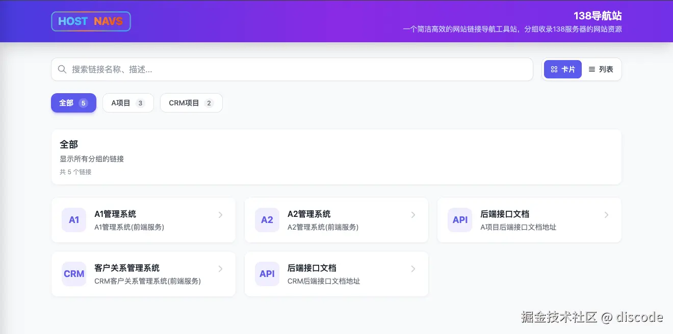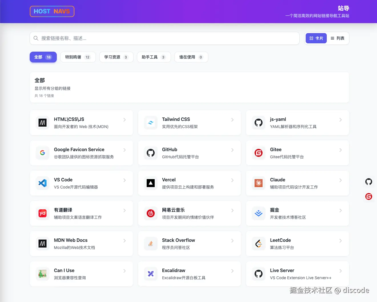 在日常开发工作中,我们经常需要访问各种网络资源,但浏览器自带书签管理以及一些主流的在线导航工具站存在如数据共享限制、数据安全管控等不便之处,尤其是在公司内网或企业级局域网等类似环境中。基于此,我通过 AI 赋能,设计并实现了 host-navs 站导 , 一个以 配置即数据 为核心设计理念的纯前端且简洁高效的网站链接导航工具站。
