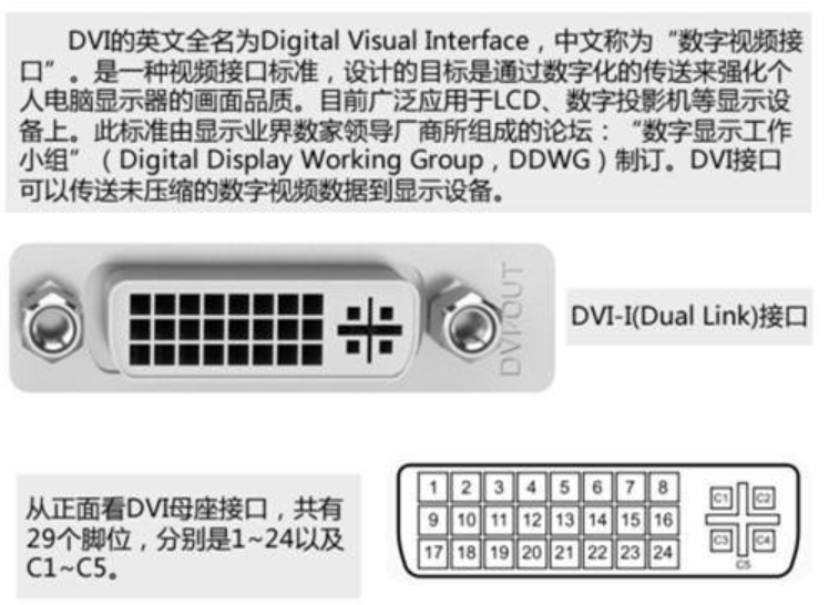 DVI接口:LCD显示器应运而生接口,DVI(Digital Video Interface),即数字视频接口。它是1999年由Silicon Image、Intel(英特尔)、Compaq(康柏)、IBM、HP(惠普)、NEC、Fujitsu(富士通)等公司共同组成DDWG(Digital Display Working Group,数字显示工作组)推出的接口标准。