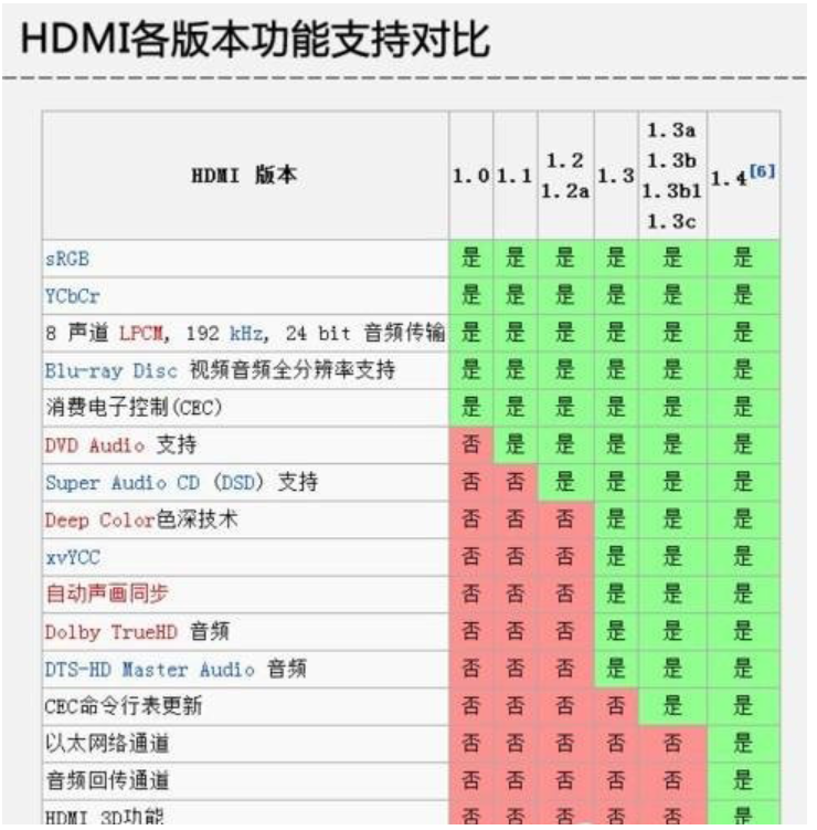 HDMI接口的优势HDMI不仅可以满足1080P的分辨率,还能支持DVD Audio等数字音频格式,支持八声道96kHz或立体声192kHz数码音频传送。 HDMI支持EDID、DDC2B,因此具有HDMI的设备具有"即插即用"的特点,信号源和显示设备之间会自动进行"协商",自动选择最合适的视频/音频格式。 与DVI相比HDMI接口的体积更小,DVI的线缆长度不能超过8米,否则将影响画面质量,而HDMI最远可传输15米。只要一条HDMI缆线,就可以取代最多13条模拟传输线,能有效解决家庭娱乐系统背后连线杂乱纠结的问题。以下是HDMI的接口参数及个版本功能的对比,如图所示: