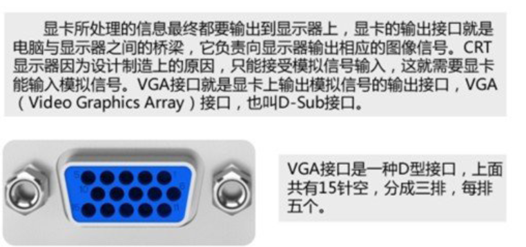 VGA接口是最常见,也就是我们通常的电脑显示器连接主机的那种,VGA接口是一种D型接口,上面共有15针,分成三排,每排五个。并且VGA接口扩展性比较强,可以轻松与DVI接口进行转换,VGA接口介绍如下图: