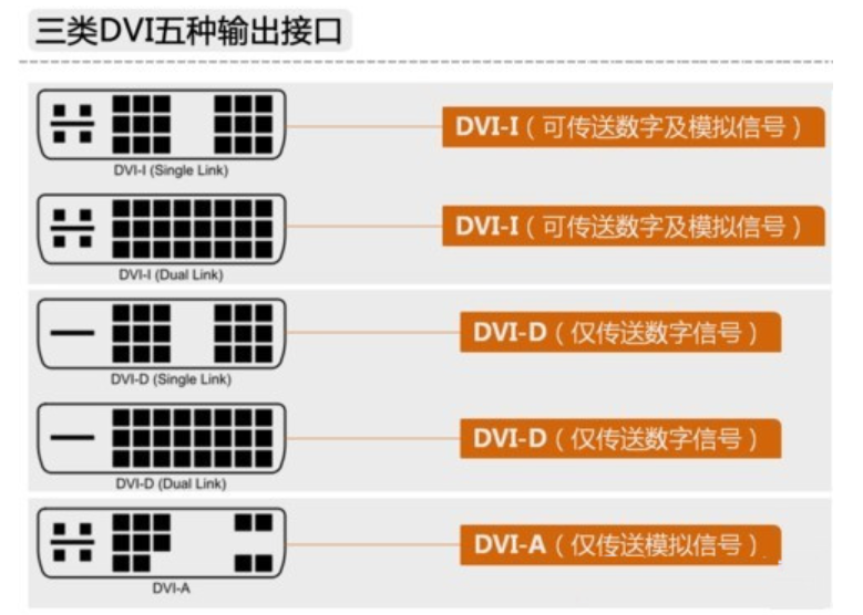 显卡接口类型,主要包括VGA、dvi/HDMI、dp这四种比较常见的接口。
