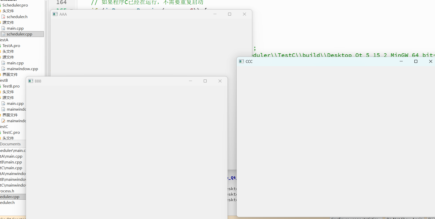 * @brief 程序调度器类,用于管理TestA、TestB和TestC三个程序的启动、监控和重启