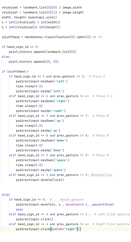 下图代码利用了pydirectinput实现了对鼠标、键盘的控制。鼠标位置根据于右手食指相对画面位置决定,利用预先设定的手势执行鼠标点击操作和键盘按键按下。在执行组合键时,将所需要的几个按键按下后延迟几秒再释放便能达到需要的效果了。