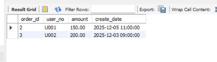 (1, 'U001', 100.00, '2025-12-01 10:00:00'),