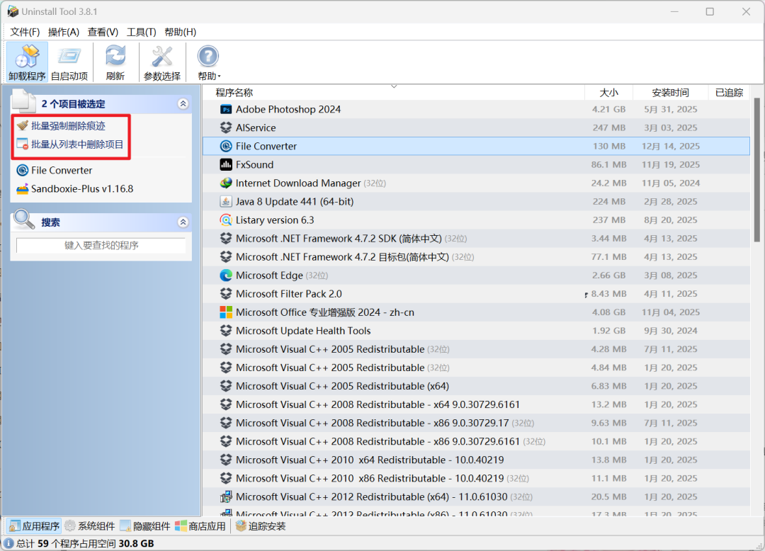 极客免费版不能批量卸,Uninstall Tool就能------多选几个应用程序,左边立马出现"批量卸载"按钮,点一下全搞定。卸载时照样检测残留,全选删除,省老鼻子事了。