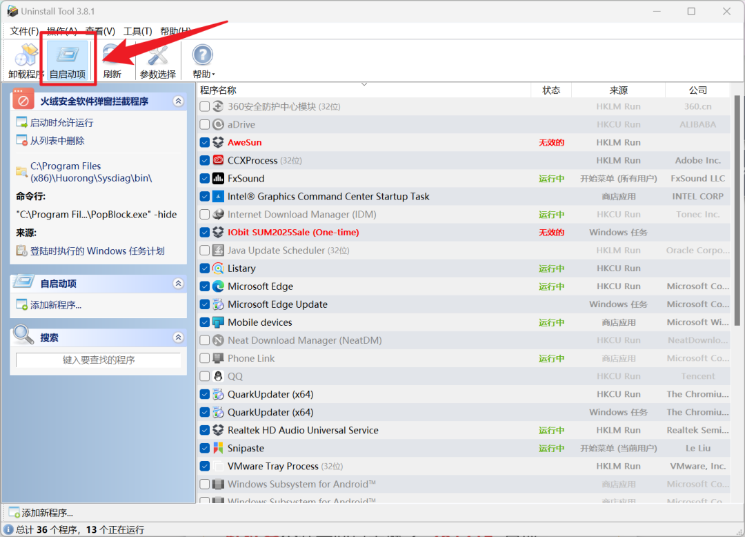 软件还能管启动项!选里想禁的程序,点"启动禁止运行"就行,开机速度能快不少,不用再手动翻系统设置了。
