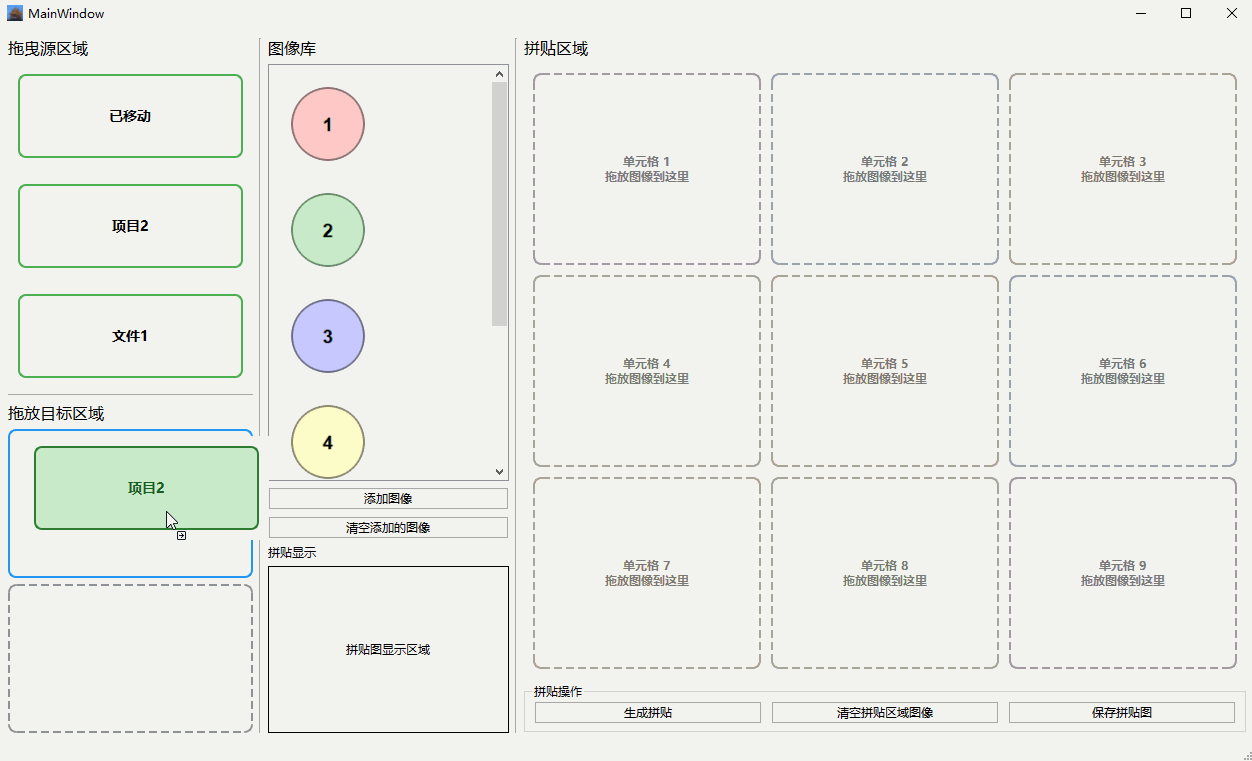 ③ cell = CollageCell(cell_index)、self.grid_layout.addWidget(cell, row, col) 函数就是对 CollageCell 类的应用,通过 for 循环在左侧界面添加单元格;thumbnail = DraggableThumbnail(pixmap, f"示例图像_{i + 1}") 函数用来在右侧进行缩略图的创建;