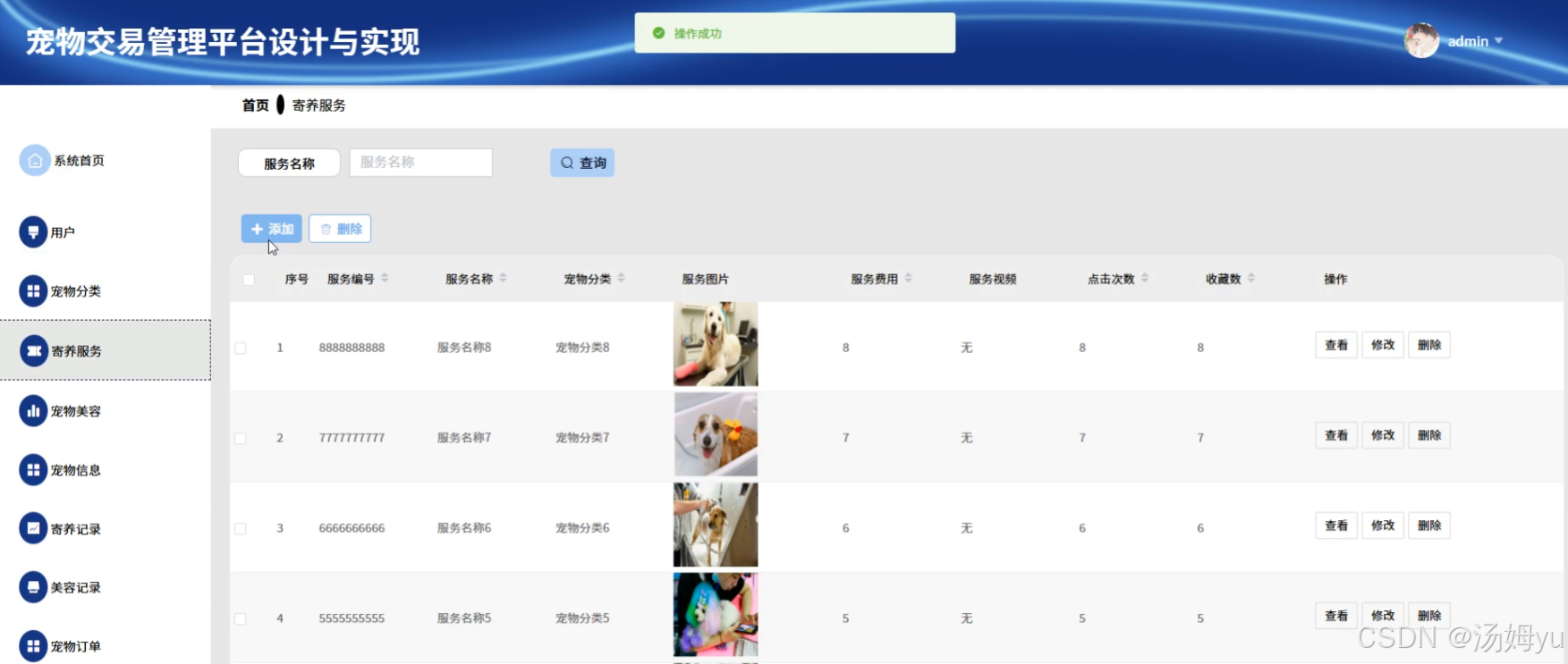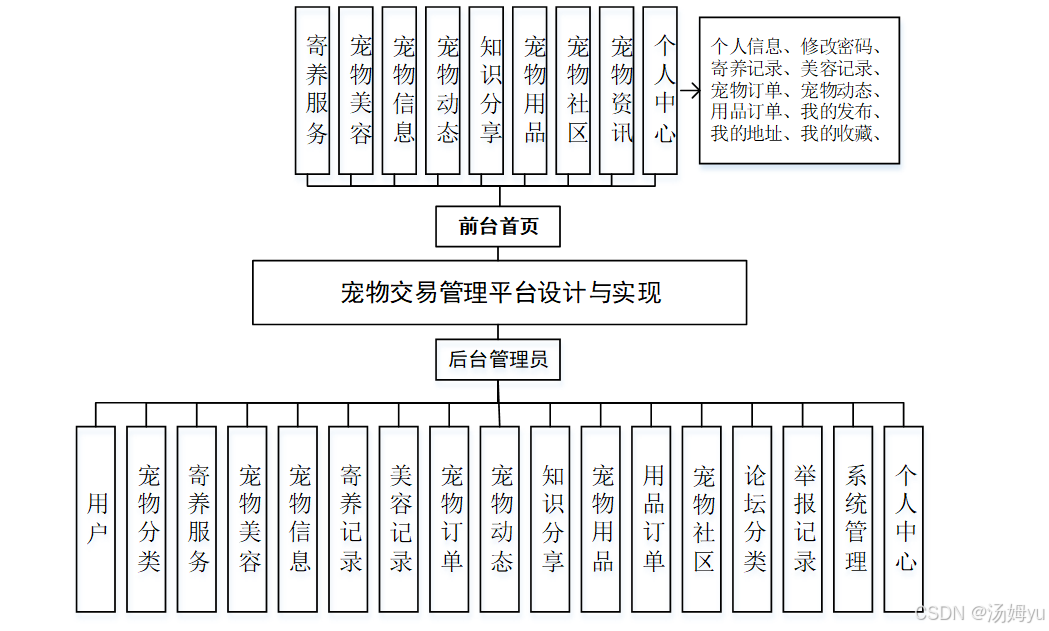 本研究旨在构建一个功能全面且高效的宠物交易管理平台,涵盖用户管理、宠物信息展示、寄养与美容服务、订单处理、动态发布、知识分享、宠物用品销售以及社区互动等多个核心模块。平台通过用户模块实现身份认证与个性化服务,同时对宠物进行细致分类,方便用户快速查找。寄养服务和美容服务模块提供预约、记录查询等功能,确保宠物得到妥善照顾。宠物信息模块详细展示宠物特征与健康状况,为交易提供保障。订单管理模块实现宠物及用品的交易流程,支持在线支付与物流跟踪。宠物动态与知识分享模块则为用户提供丰富的资讯与经验交流空间。宠物用品模块涵盖各类用品的销售与订单管理,满足用户多样化需求。社区互动模块通过论坛分类和举报记录功能,营造安全、活跃的交流环境。系统管理与个人中心模块则为平台运营和用户个性化设置提供支持,整体提升用户体验与平台运营效率。