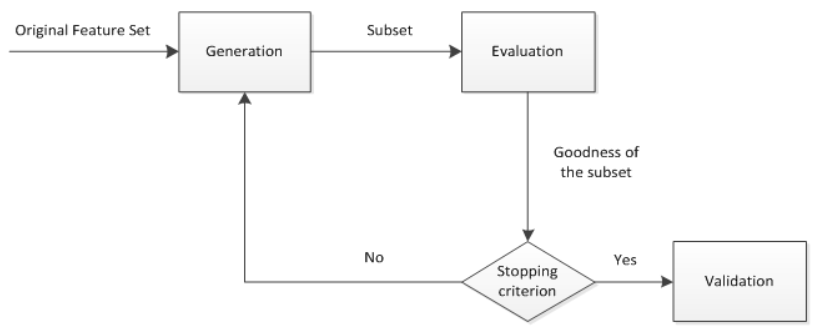 特征选择 首先从特征全集中产生一个特征子集,然后用评价函数对该特征子集进行评价,评价结果与停止准则进行比较,如果评级结果比停止准则好就停止,否则就继续产生下一组特征自己,选出来的特征子集一般还要验证其有效性。