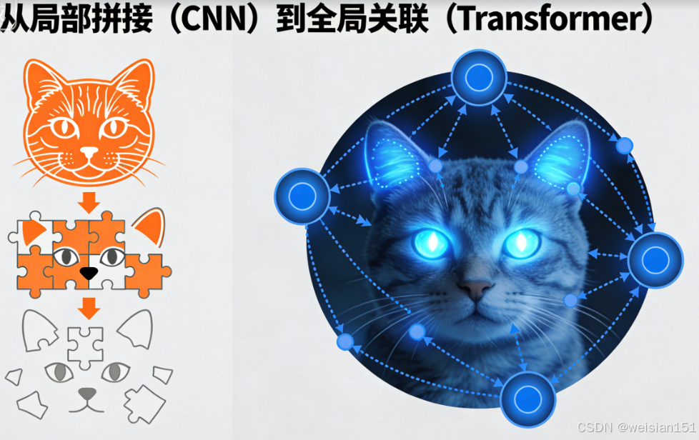 - Transformer 认图像"看地图找目标":先把整个地图(整张图片)的所有信息都装进脑子里,然后根据"找猫"这个目标,直接把注意力集中在猫所在的区域,同时还能记住猫和周围环境(沙发、落地灯)的关系。