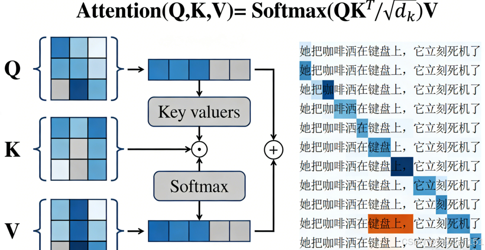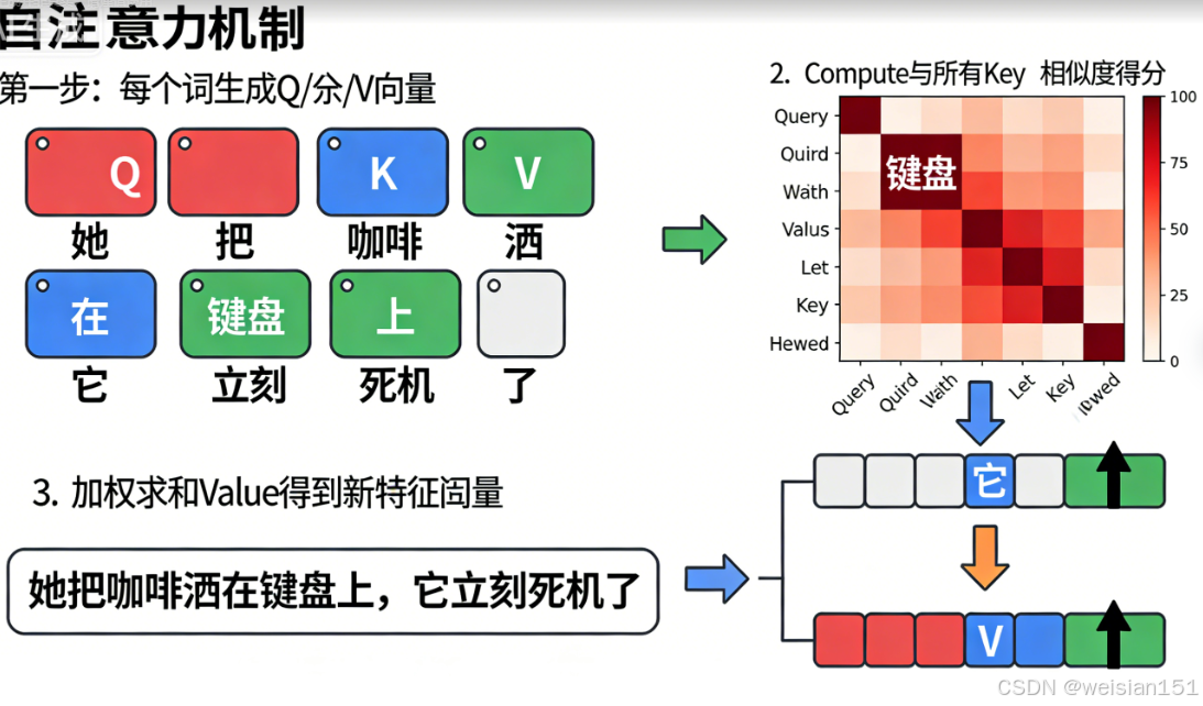 | 全局建模能力 | 任意两个元素可直接交互,无距离限制 | CNN 感受野有限,RNN 信息衰减 |