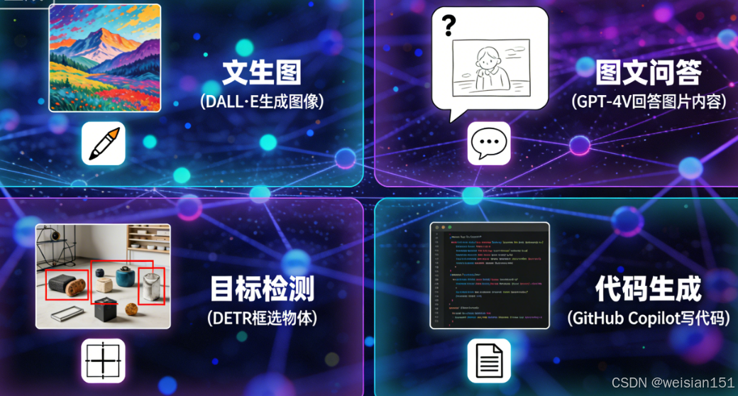 - 多模态理解:CLIP 模型能同时理解图和文,实现"以图搜文"或"以文生图"。