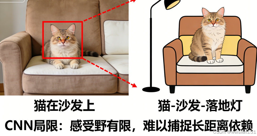 例如一张"猫坐在沙发上,旁边有个落地灯"的图片,CNN 能轻松认出"猫""沙发""落地灯"这些单个物体,但很难理解它们之间的关系:"猫在沙发上""落地灯在沙发旁边"。