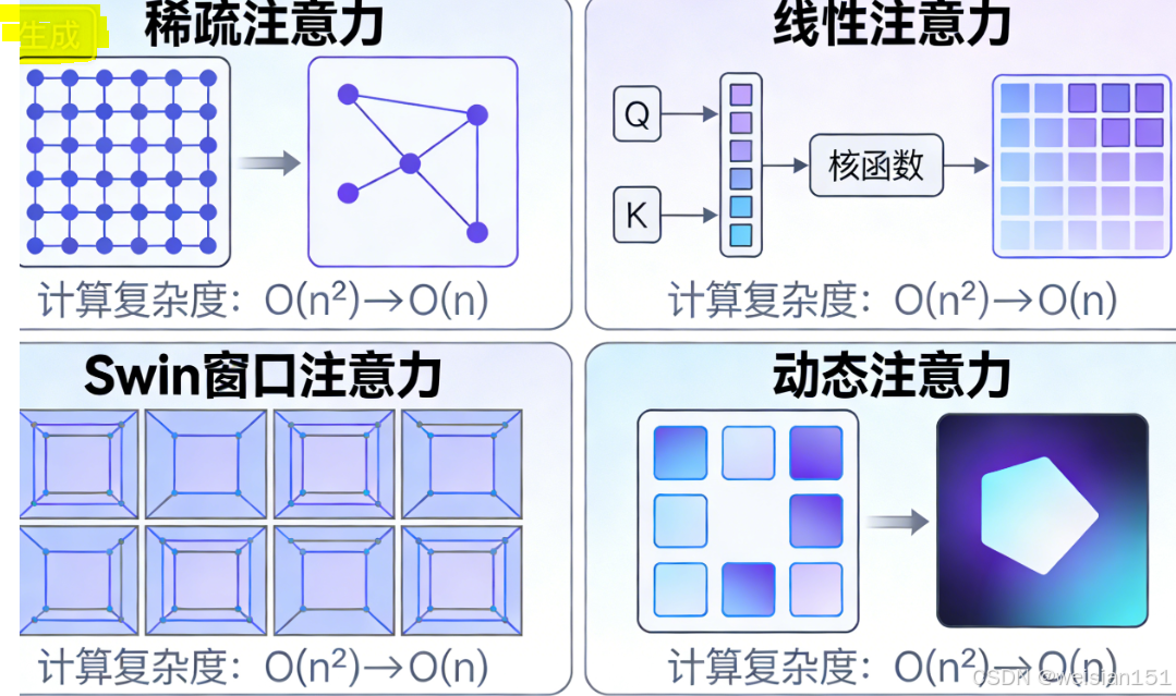 → 解法:稀疏注意力(Longformer)、局部窗口(Swin)、线性注意力(Performer)。