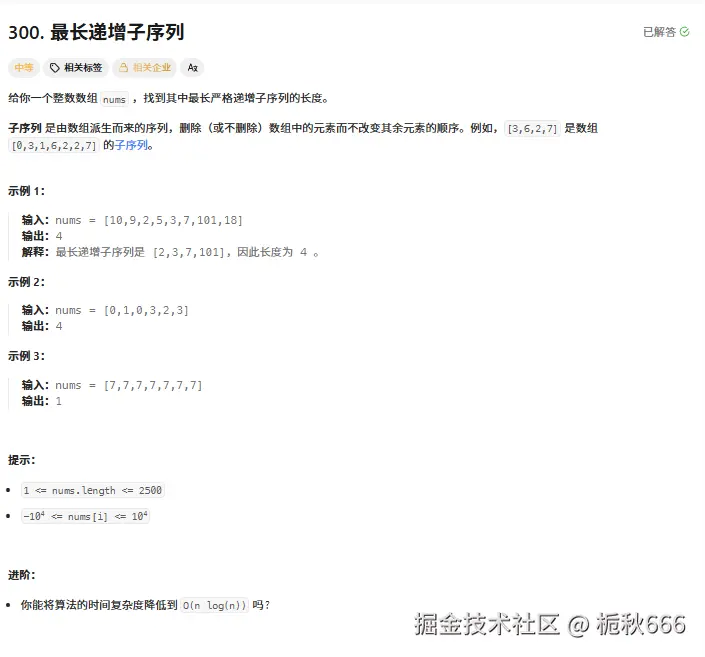 [2,3,3]不算,[2,3,4]才行。 - 只需要返回长度,不要求输出具体序列(除非面试官坏笑说:"那你打印一下?")
