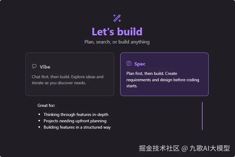 Kiro提供了两种编程思路,一种是Vibe,就是边聊边构建代码,这个其它产品都有类似的功能。我们重点看一下Spec模式。