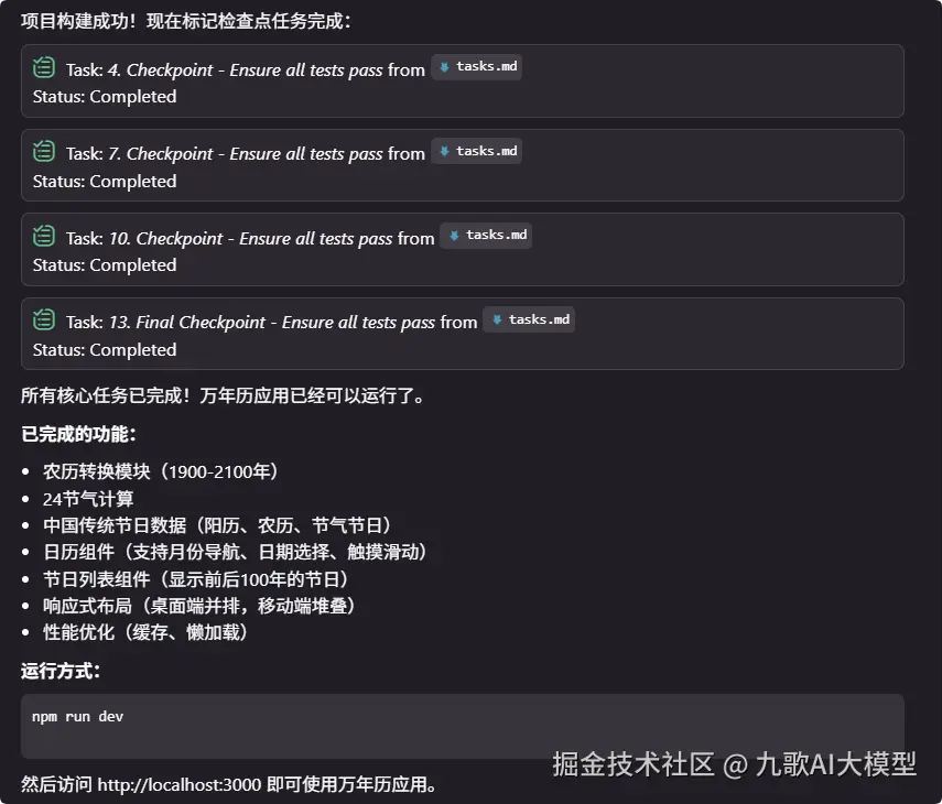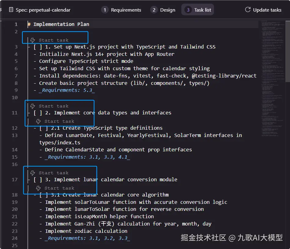 最后这个过程,Kiro交出了一份开发任务清单,总共13个大任务和几十个子任务。我这里放个局部细节图。