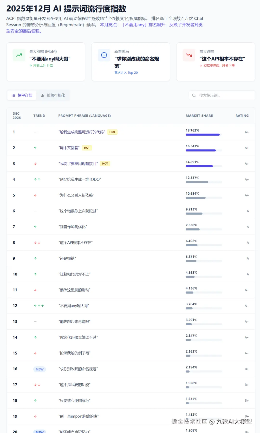 之前刷到过一个非常有意思的排行榜,AI编程提示词排行榜,这里贴出来大家乐呵一下,反正我第一次看到,差点喷饭,真的太经典了!