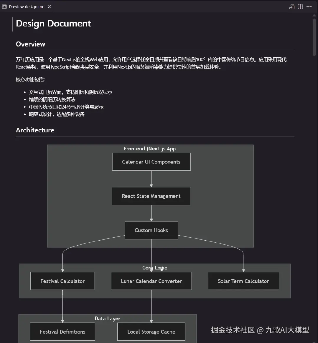 我们来大致看一下Design.md的内容。针对需求文档,Design.md提供了这个的技术整体架构,包括核心组件和接口的标准。