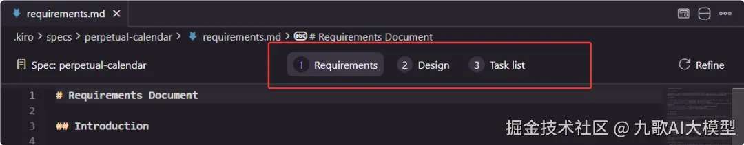 这里面最重要的是创建了需求文档requirements.md,但是这个不是普通的Markdown文件,实际包含了三个过程:Requirements、Design和Task List。目前Kiro只完成了第一个过程,这个需求文档你可以继续提出修改意见。