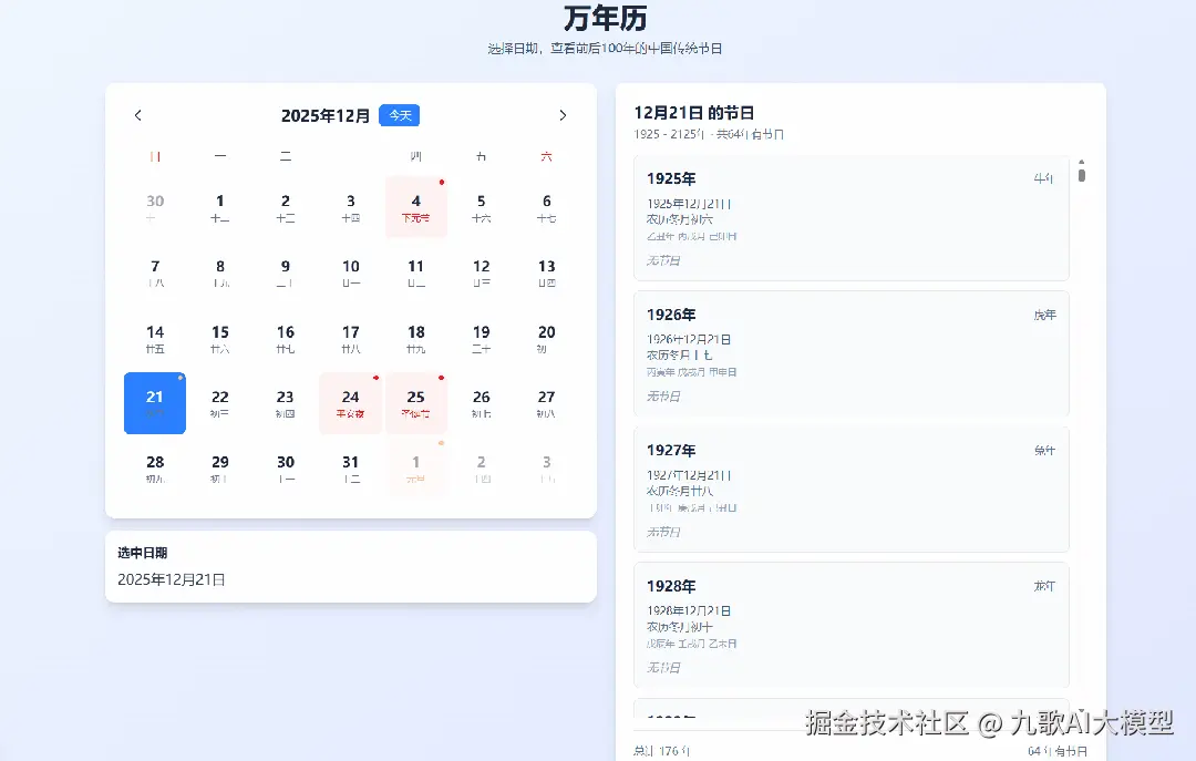 <goal>开发一个万年历应用,选中某一天,就能显示前100年和将来100的这一天有哪些中国传统节日,比如元旦,冬至。</goal>