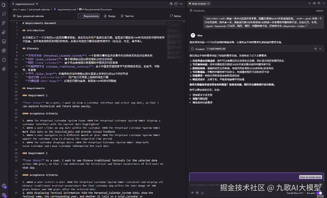 现在我们用一个万年历网页的简单示例来看一下Kiro的Spec 编程方式。