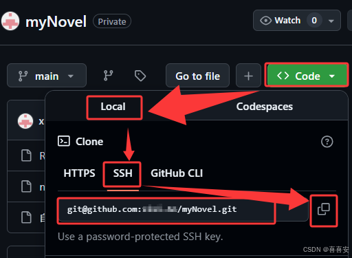 git clone git@github.com:...... (git@github.com:......是你要复制的一个项目的仓库地址,这一部分的内容获取如下图所示)