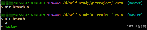 如果我们想在此基础上新建一个分支呢? 只需执行命令git branch a 就新建了一个名字叫 a 的分支。
