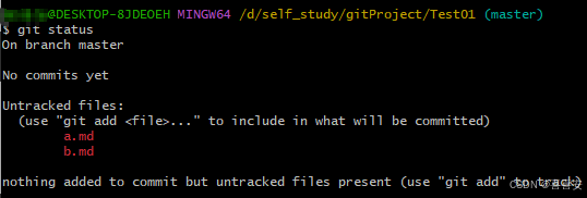 git status(会提示 "有未跟踪的文件",红色字体)。
