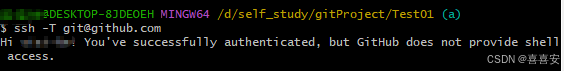 SSH key添加成功之后,输入ssh -T git@github.com进行测试,如果出现以下提示说明添加成功: