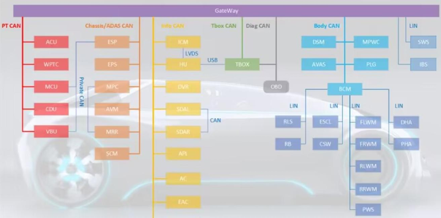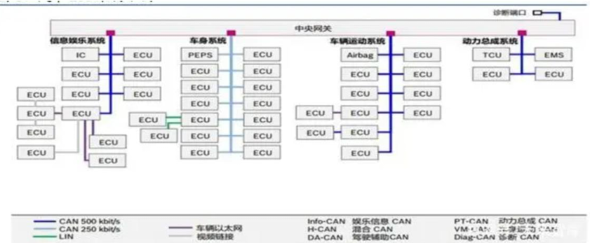 传统汽车的电子模块多为点对点通信,而现代汽车采用分布式网络架构,按功能划分为多个网段: