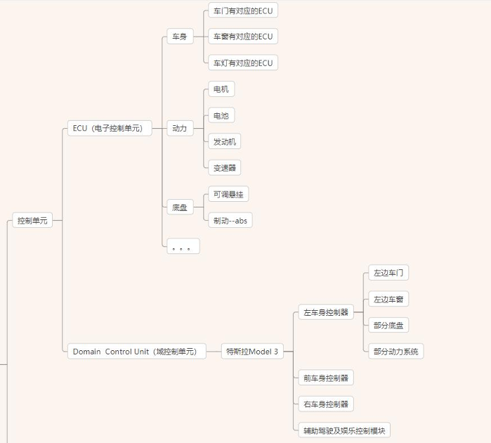 主要的电子电气控制设备为: ECU 电子控制单元 、 DCU 域控制器 (将一些功能集中到一个控制器进行控制)