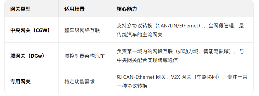 网关就像这些网段之间的 "桥梁",同时具备数据转发、协议转换、网络管理、安全防护四大核心能力,是整车数据交互的唯一通道。