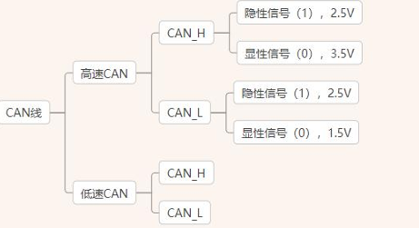 CAN 高输出2.5V 时,CAN低必须输出2.5V, 此时两根线之间的电压差(差分信号)为0V, 称为"隐性信号", 表示二进制1; - 通常can高和can低之间 应该有一个120欧姆的终端电阻。