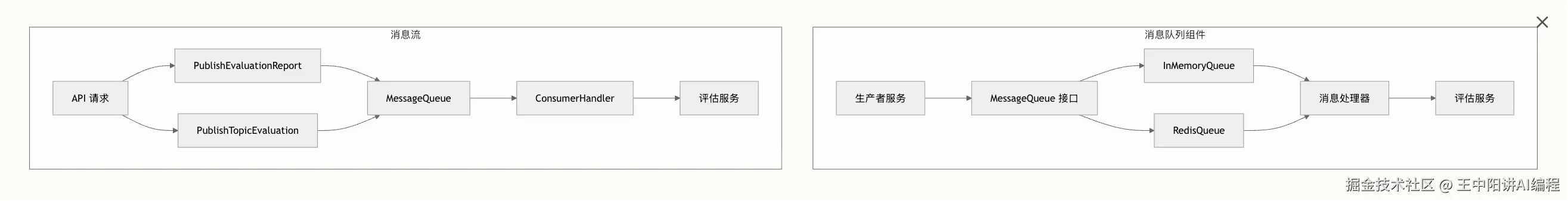 Go-Eino Interview Agent 平台中的消息队列架构实现了一个异步处理系统,旨在处理评估报告生成和主题评估任务。该架构提供可靠的消息传递、可扩展的处理能力以及灵活的后端实现。