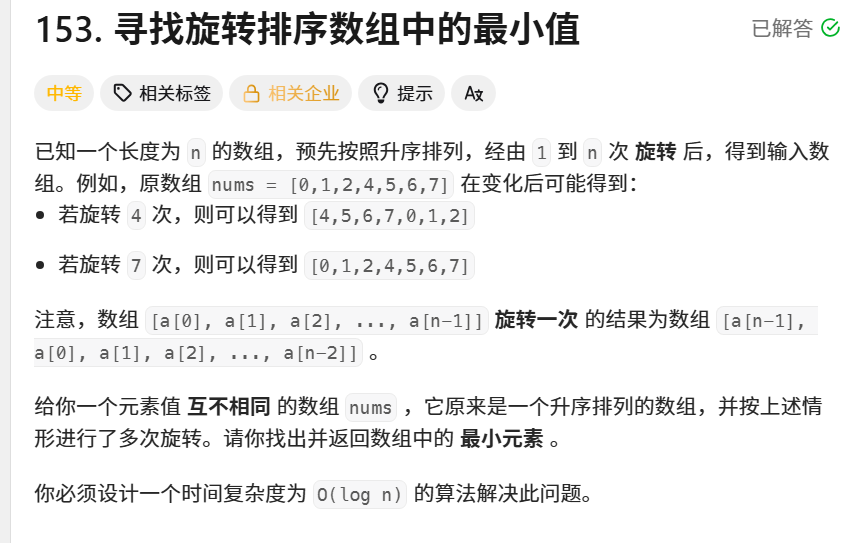 本题可以借用二分查找的思路:设 x=nums[mid] 是现在二分取到的数。我们需要判断 x 和数组最小值的位置关系,谁在左边,谁在右边?把 x 与最后一个数 nums[n−1] 比大小:
