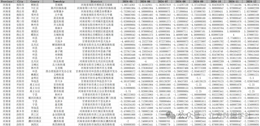 基于1958年-2024年逐月帕尔默干旱严重程度栅格数据,依据上述乡镇行政边界数据,对每个乡镇(街道)的逐月帕尔默干旱严重程度栅格进行了求平均值处理,最终得到了全国乡镇(街道)的逐月帕尔默干旱严重程度数据。