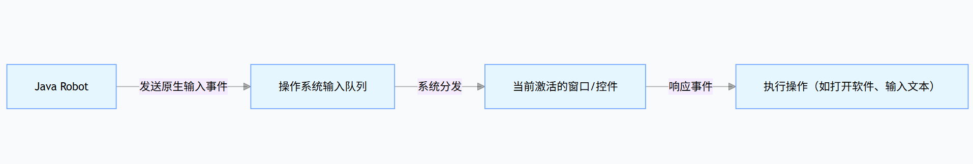 Robot 的本质是 "操作系统输入队列的投递者"------ 它不直接和目标应用交互,而是将鼠标 / 键盘事件发送到操作系统的全局输入队列,由系统分发给当前激活的窗口 / 控件,流程如下: