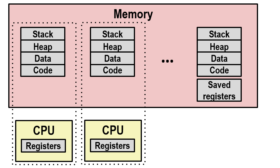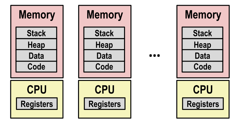 - 逻辑情况:多个进程看似同时运行,独立使用栈、堆、CPU、寄存器等相关部件。